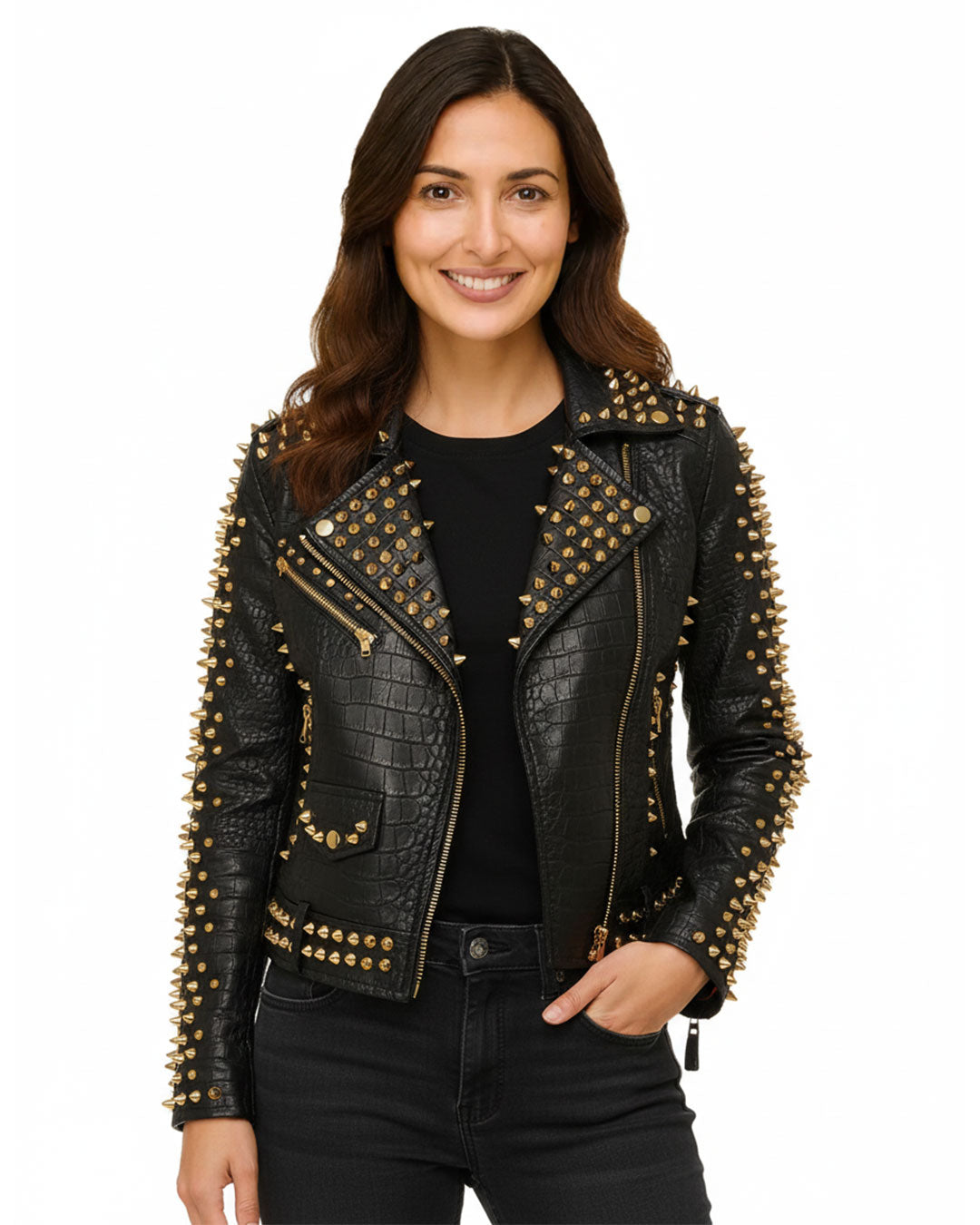 Women’s Black Crocodile Texture Studded Leather Jacket