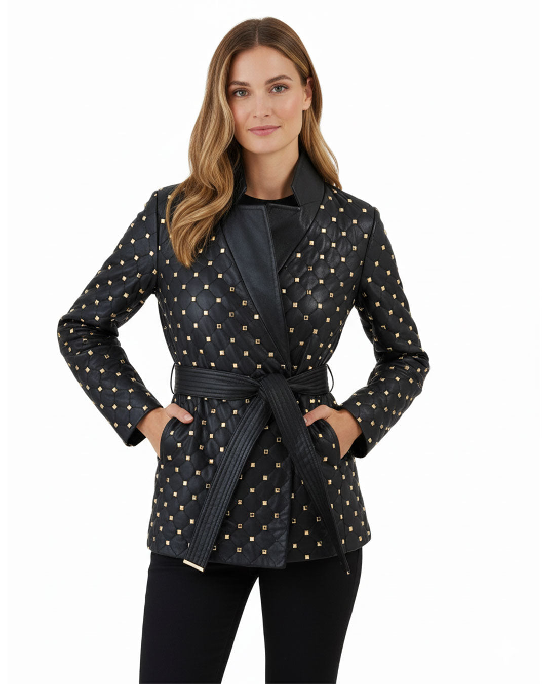 Add the Women’s Black Leather Blazer with Gold Studded Accents to your wardrobe and embrace a timeless yet rebellious fashion statement. Order now from Trippprs and experience elegance with an edge!