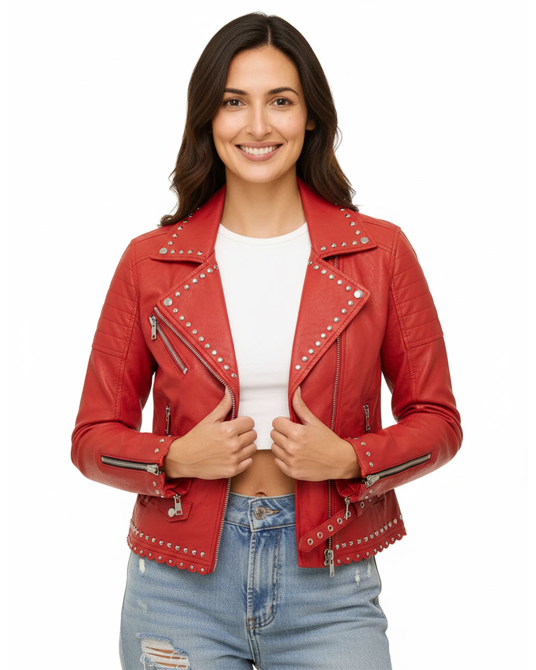 Upgrade your wardrobe with the Women’s Cropped Red Studded Leather Jacket—a bold fashion essential designed for fearless, trend-setting women. Shop now and make a statement that lasts!