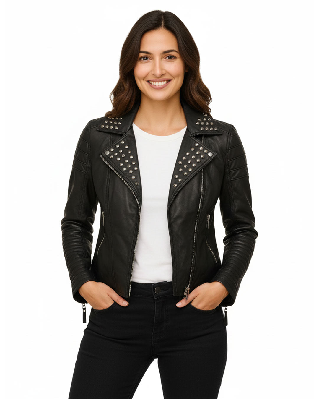Add a bold and stylish touch to your wardrobe with the Kelly Studded Black Leather Biker Jacket. Designed for fearless fashionistas, this jacket blends rockstar edge with timeless elegance. Order now and embrace your inner rebel!
