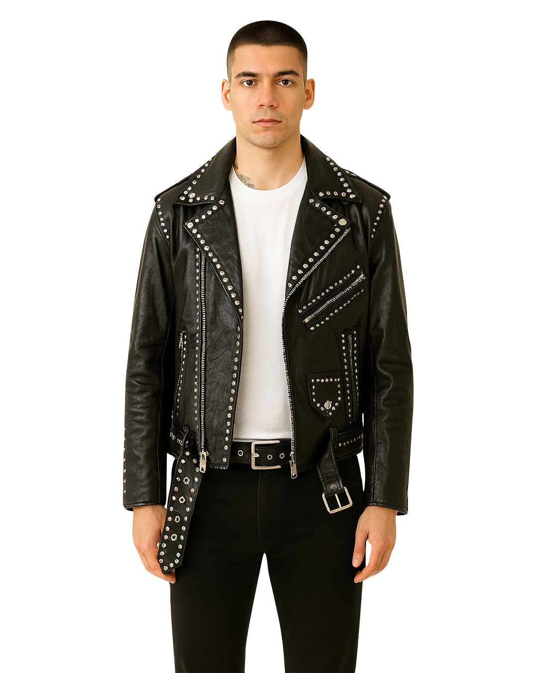 Experience the ultimate blend of bold style and durability with the Men’s Silver Studded Leather Biker Jacket. Crafted from premium faux leather, this jacket features striking silver stud detailing for a rebellious, punk-inspired look. Designed for comfort and a perfect fit, it combines classic biker elements with a modern twist. Tailored to elevate your wardrobe, it offers bespoke sizing options, free shipping, and a one-year leather replacement guarantee, ensuring both style and peace of mind with every purchase.