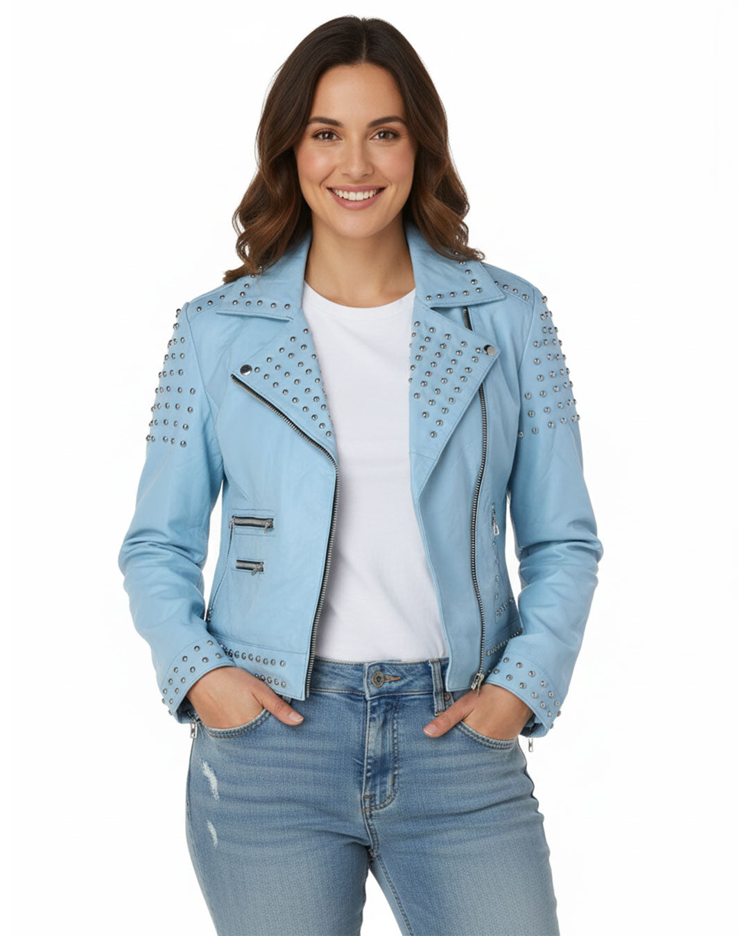 Make a fearless fashion statement with the Punk Women’s Studded Leather Jacket in Sky Blue. Designed for those who dare to be different, this vibrant and rebellious piece combines high-quality craftsmanship, striking studded embellishments, and an electrifying punk rock aesthetic. Whether you’re hitting the streets, going to a concert, or looking to add an eye-catching touch to your wardrobe, this jacket guarantees confidence and individuality.
